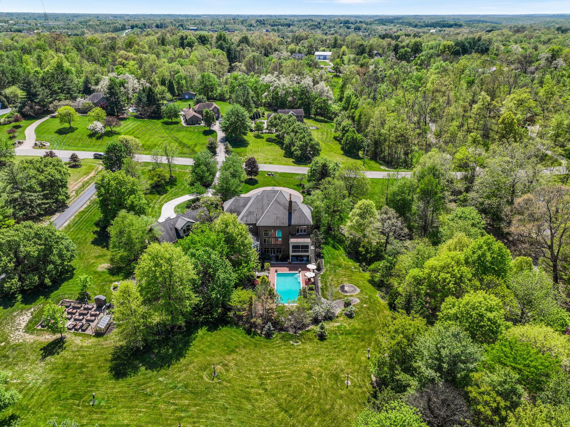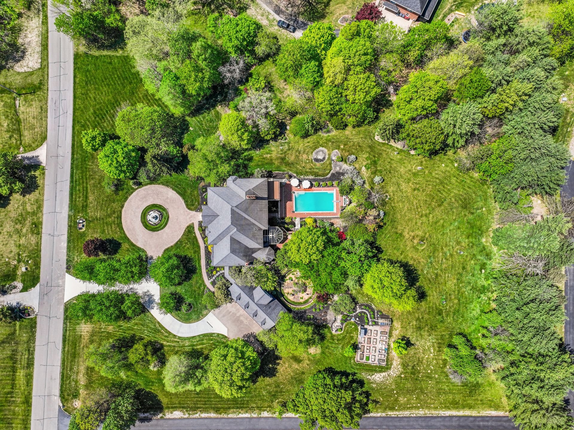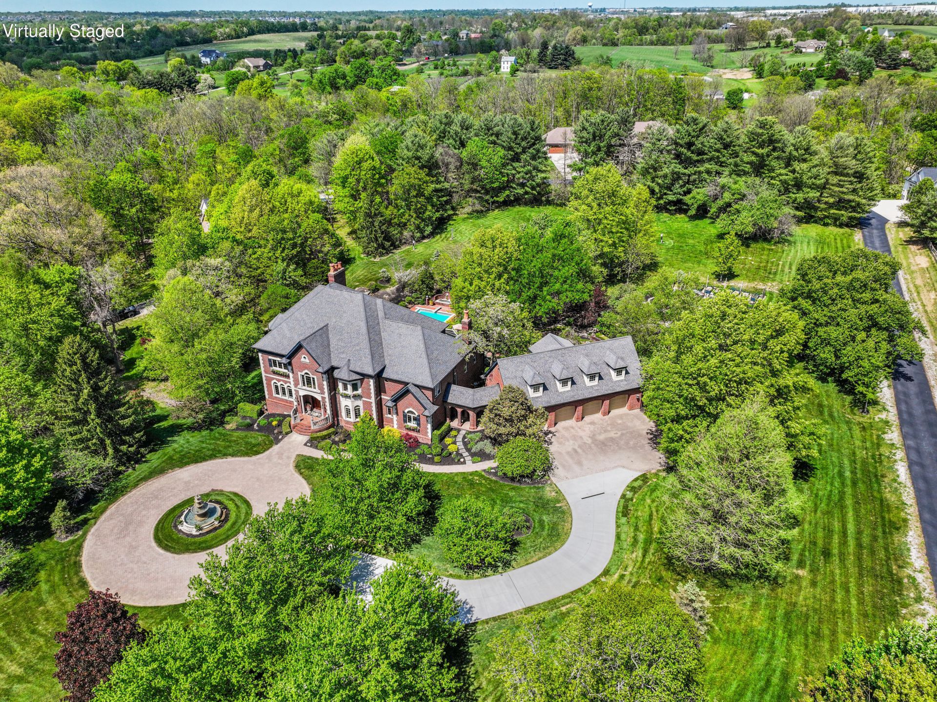 Elegant European Manor Estate with Subtle French Provincial Influences, Set on 3.6 Beautiful Landscaped Acres & Offering Over 11,500+ SQ FT w/ Three Finished Levels. A Stately Brick & Stone Exterior, Defined by Arched Windows, Limestone Accents, & a Circular Drive Anchored by a Grand Multi-Tiered Fountain, Creates a Striking & Unforgettable Arrival. Inside, a Dramatic Two-Story Foyer with Sweeping Curved Staircase, Marble Flooring, & 10-Foot Mahogany Entry Door with Leaded Glass & Arched Transom Sets the Tone for Exceptional Craftsmanship. Exquisite Millwork, Elaborate Moldings, Statement Fireplaces, & Custom Bars are Complemented by Architectural...read more