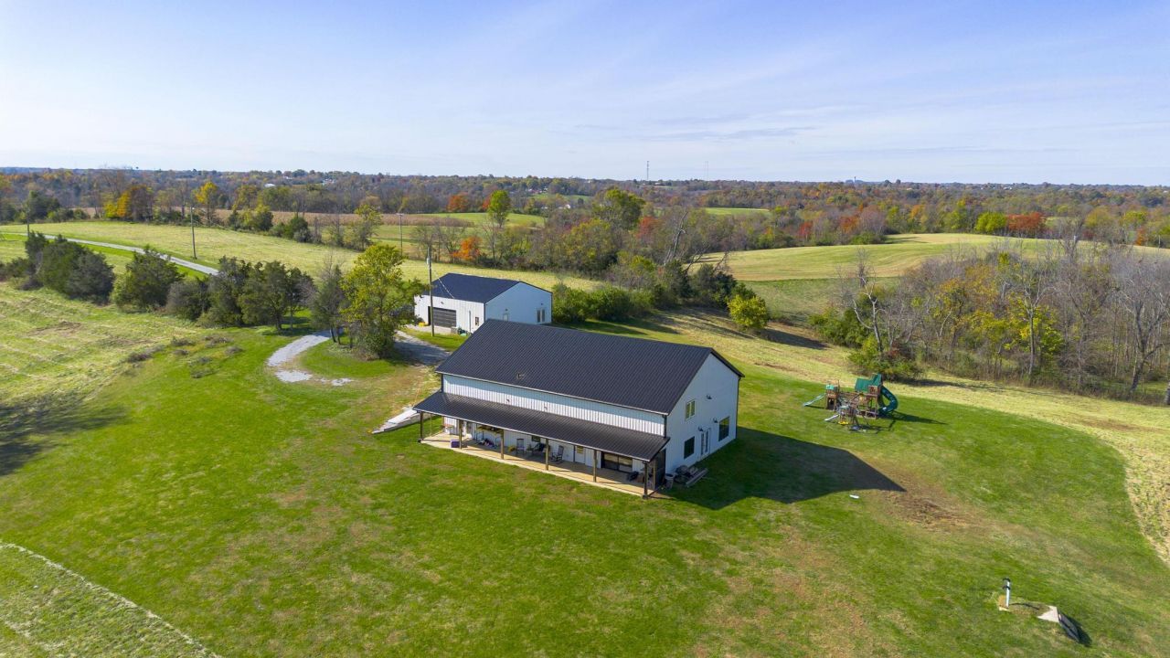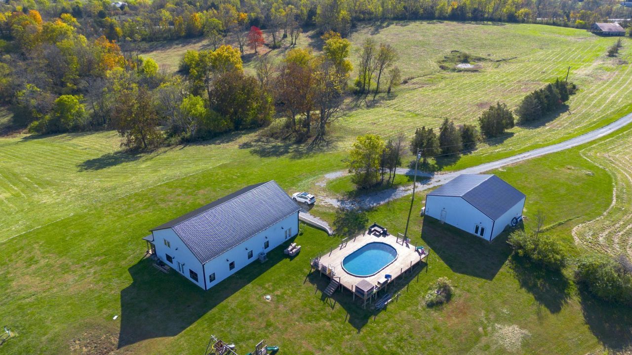 If total privacy is your dream, this is the oasis you need. Enclosed on 61 acres with no neighbors in sight, this modern barndominium blends luxury, function, and freedom, just seconds from I-71. Beyond keypad-controlled gates lies a 2,700 sq ft 5-bed, 2.5-bath retreat with 10 ceilings, 23 vaulted living room, floor-to-ceiling fireplace, and a bold kitchen with custom blue cabinets, butcher block counters, designer tile, and farmhouse finishes. The primary suite is a spa-like escape, while 1,000+ sq ft of flex space offers room for a gym, golf sim, or man cave. Enjoy sunset in the hot tub or pool, or sunrise over your private pond. A 3-car...read more
